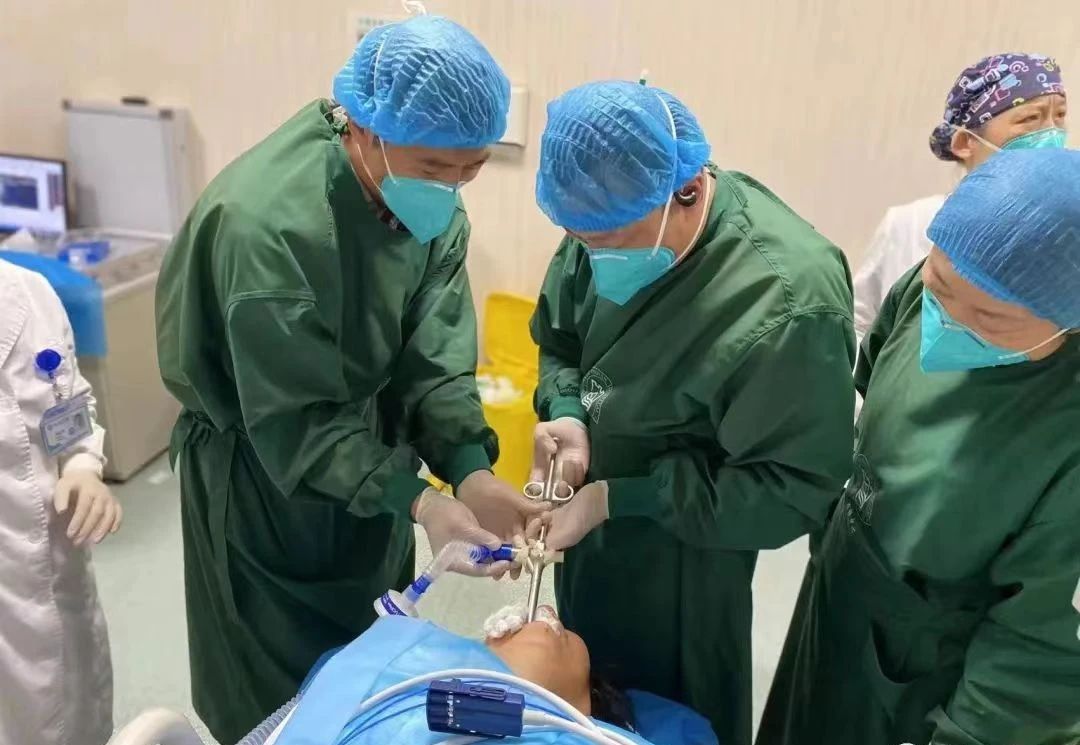 術中,李紹先率領團隊,在麻醉科、內鏡中心等科室積極配合下,首先置入硬質支氣管鏡,發現在聲門下5cm左右氣道嚴重狹窄約80%,并有大量干酪樣壞死及膿性分泌物,應用氬氣燒灼及二氧化氮冷凍治療,清理壞死物及肉芽組織后,團隊仔細測量氣道狹窄長度,量體裁衣,制成Y型硅酮支架,成功置入。